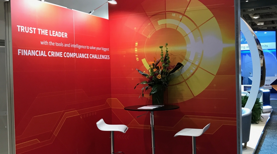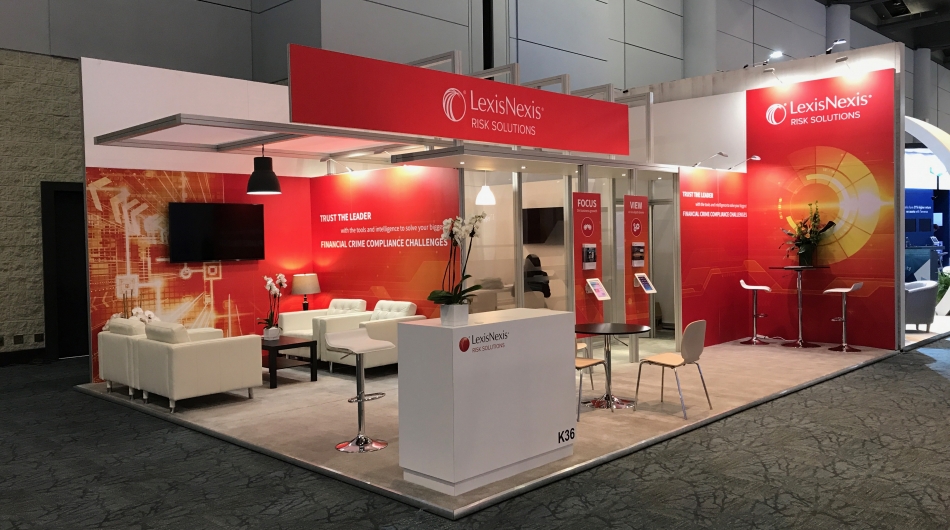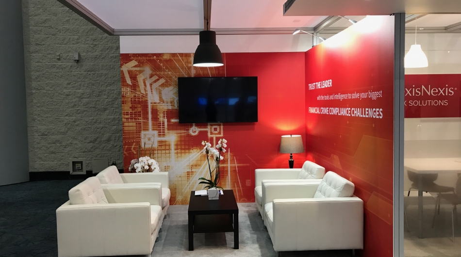 Design and prepare an exhibit that would be used in a high profile global banking show that would take place in Toronto, Canada. Create a professional image utilizing corporate branding, and allowing for both private and public meeting spaces to be utilized. Client wished to be able to demonstrate web-based products on iPads located within the booth as well as show corporate videos and product demonstrations.