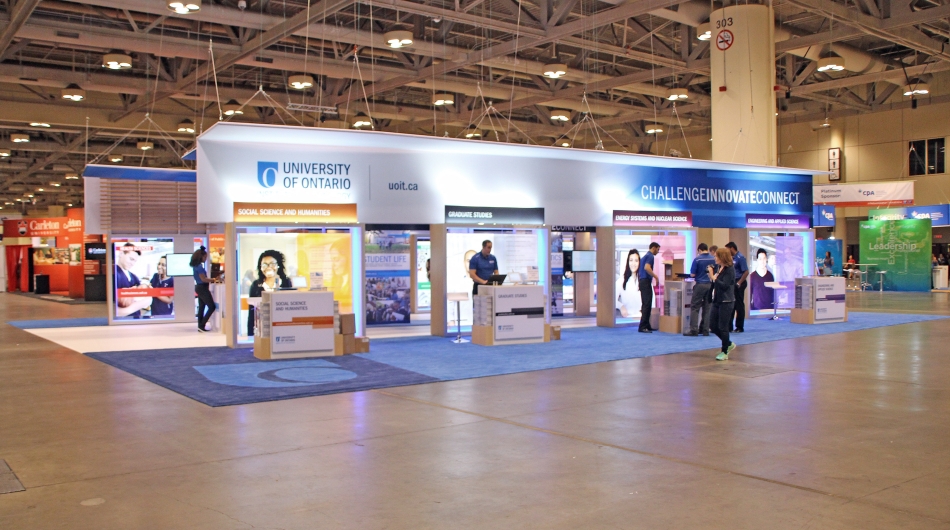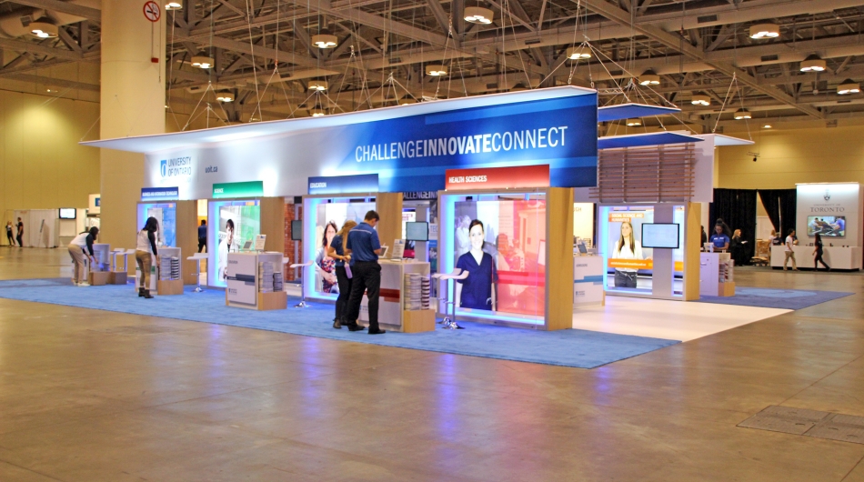 stevens E3 designed and built a unique design that took advantage of an island shape, but tilted the exhibit on its axis in order to attract the eye. Large backlit graphics, glowing LED lighting in corporate colours, and huge overhead tensioned fabric structures helped to identify the brand quickly and effectively. 12 touch screen monitors were included within the pavilion to allow interactivity with students without having to have a UOIT representative with the student all the time, and allowing the student to explore the campus by themselves interactively. Faculty counters, each branded with UOIT branding, were developed with customized brochure dispensing embedded within the counter to reduce floor space but maximize brochure dispensing capabilities. Carpeting was brightly coloured with custom logo inlays to continue the brand experience attendees would have in walking the booth. Our "pathway to success" through the centre of the booth allowed for two "hallways" where campus lifestyle was depicted allowing the student to truly "put themselves on campus" at the event. Elements from architecture within the campus were emulated within the booth environment.