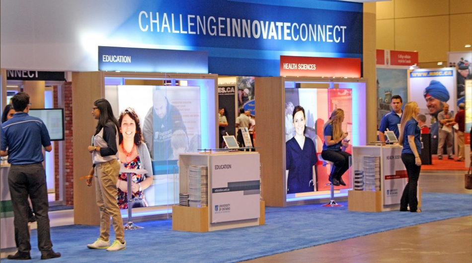 UOIT needed an exhibit that would address significant traffic flow issues and the management of directing students/attendees to the program faculties they were specifically interested in for 120,000 attendees across 3 days. They also needed a way to dispense several thousand brochures (prospectuses) and keep dispensers full at all times.